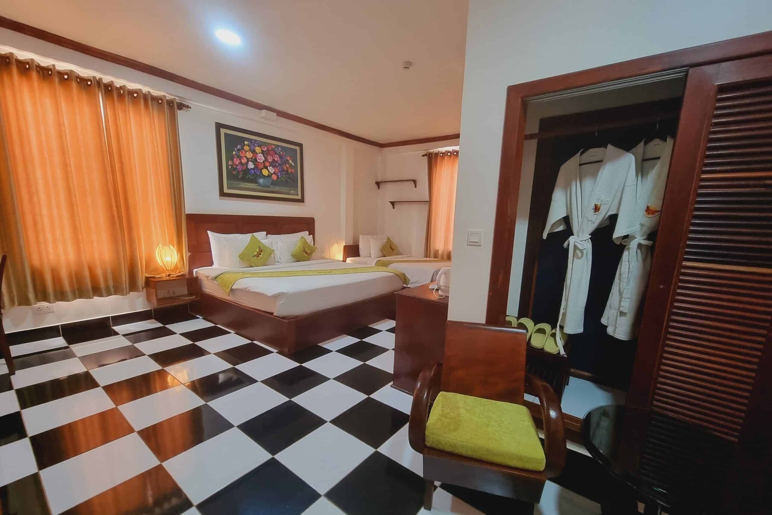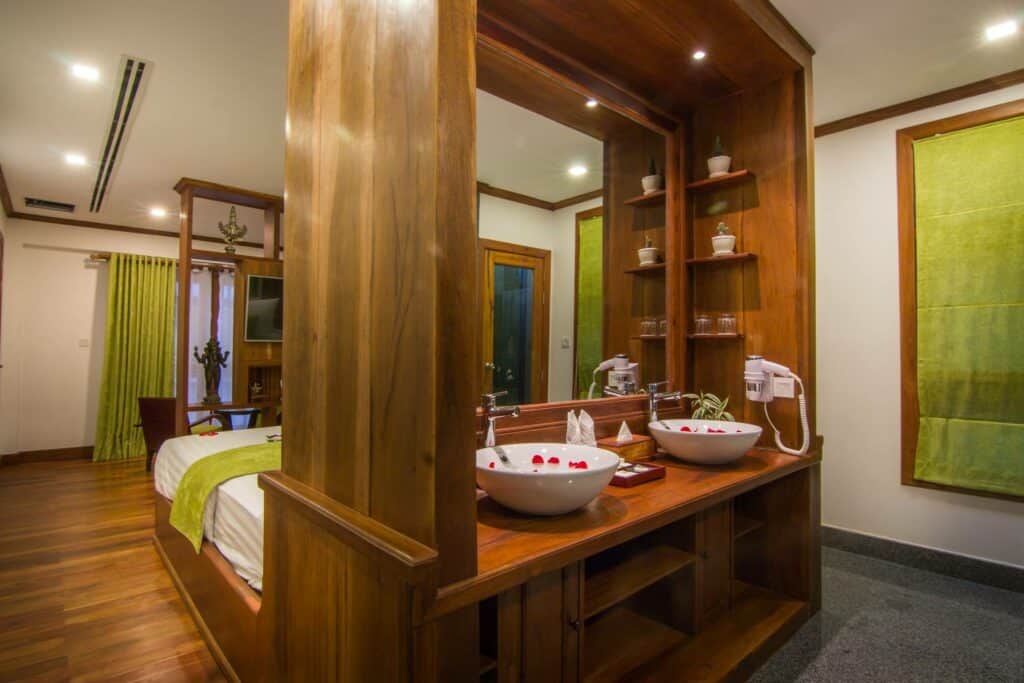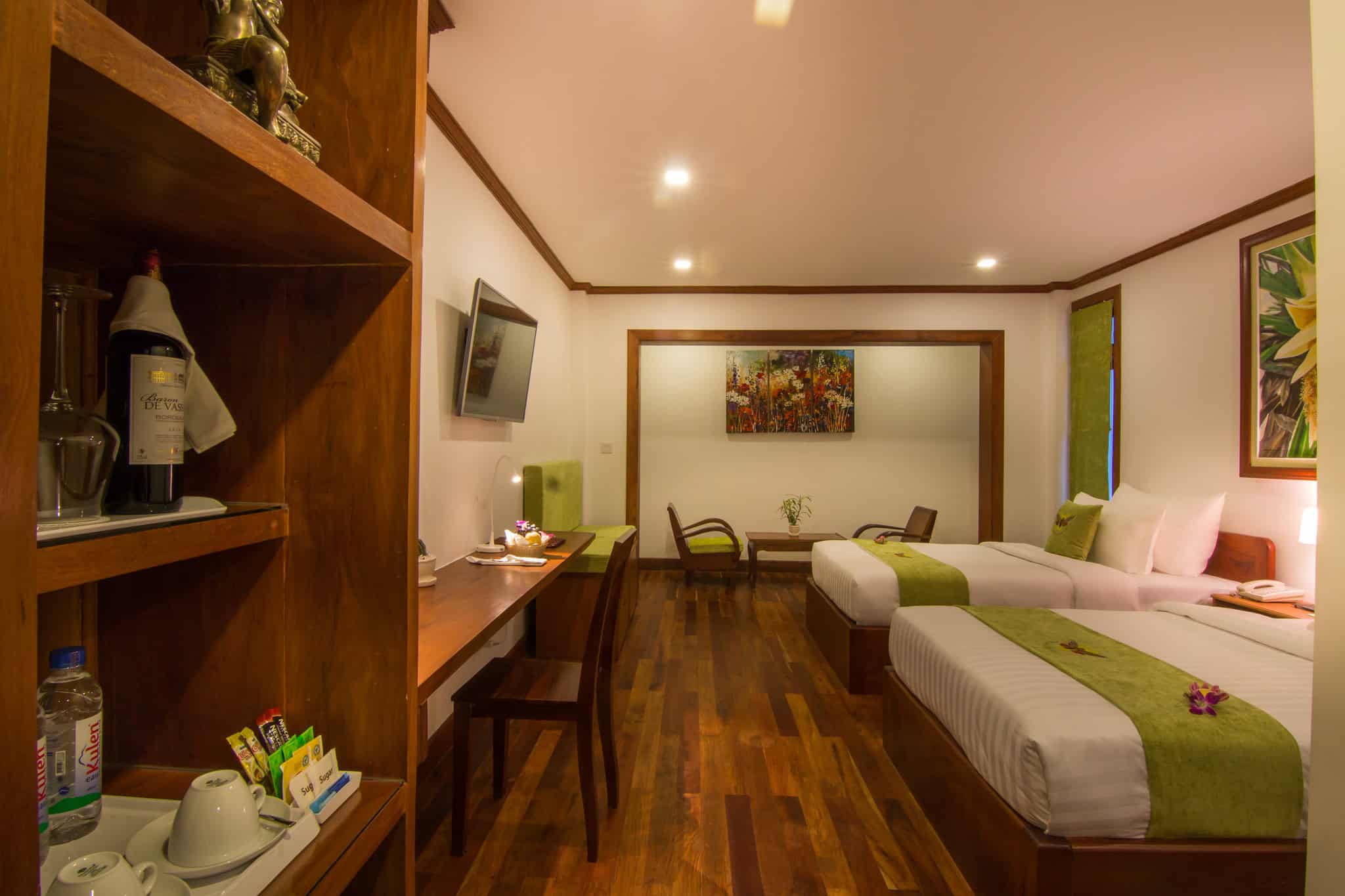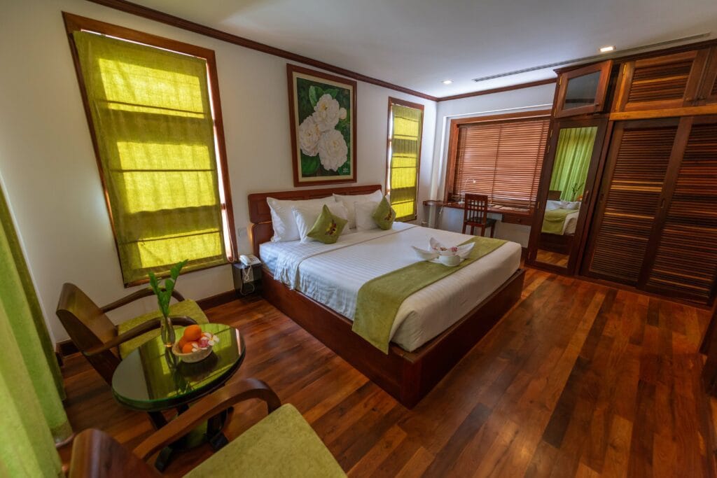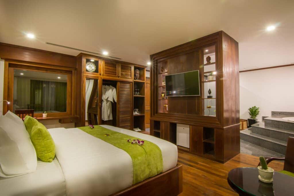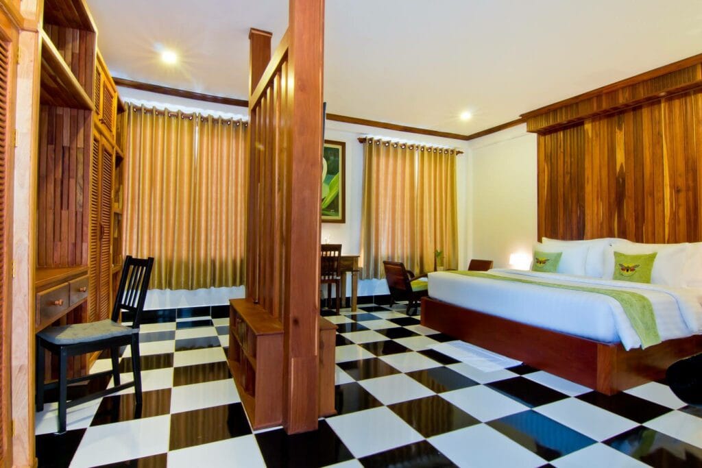 With a generous layout, this suite features a king-size bed, a private balcony overlooking the pool, and a large seating area. The bathroom includes both a bathtub and a shower for your comfort. Perfect for couples, honeymooners, or long-stay guests who want to experience the very best of Siem Reap hospitality.
