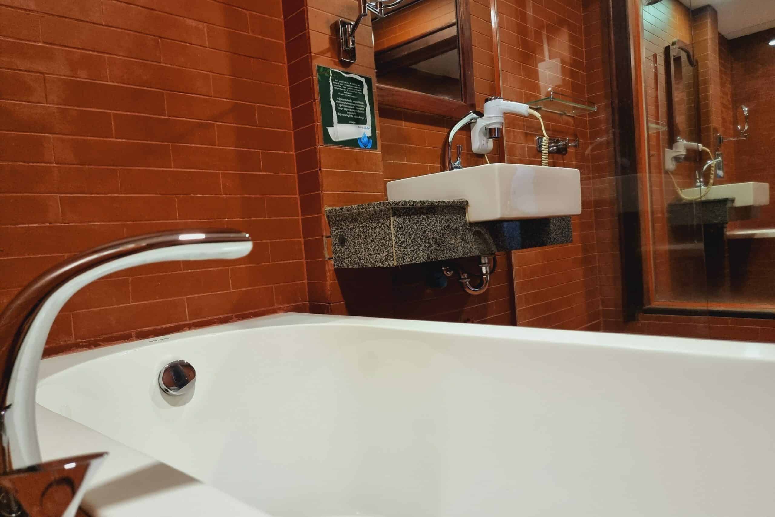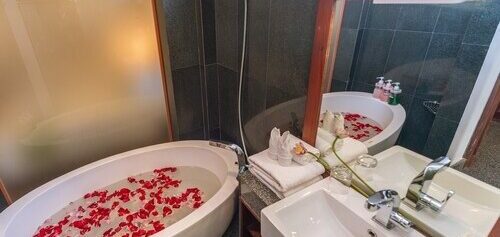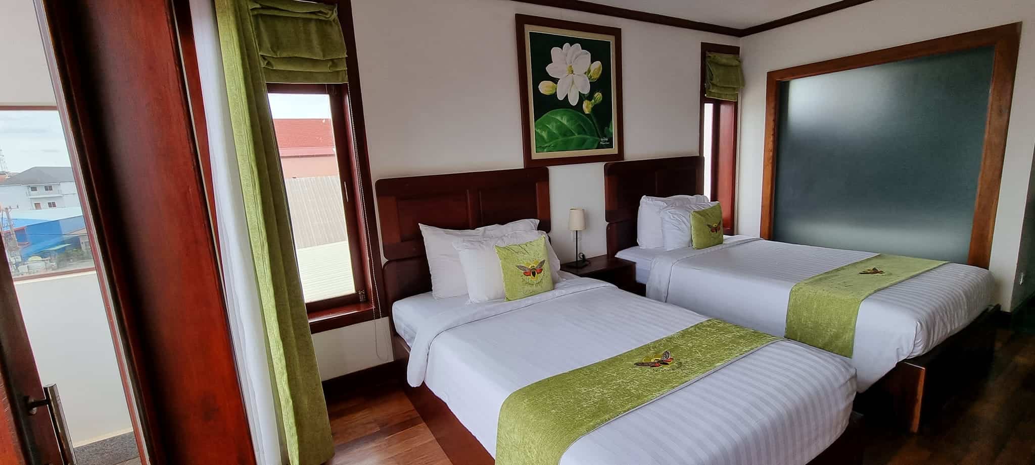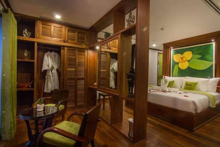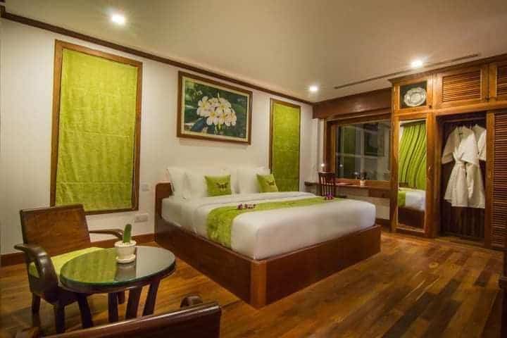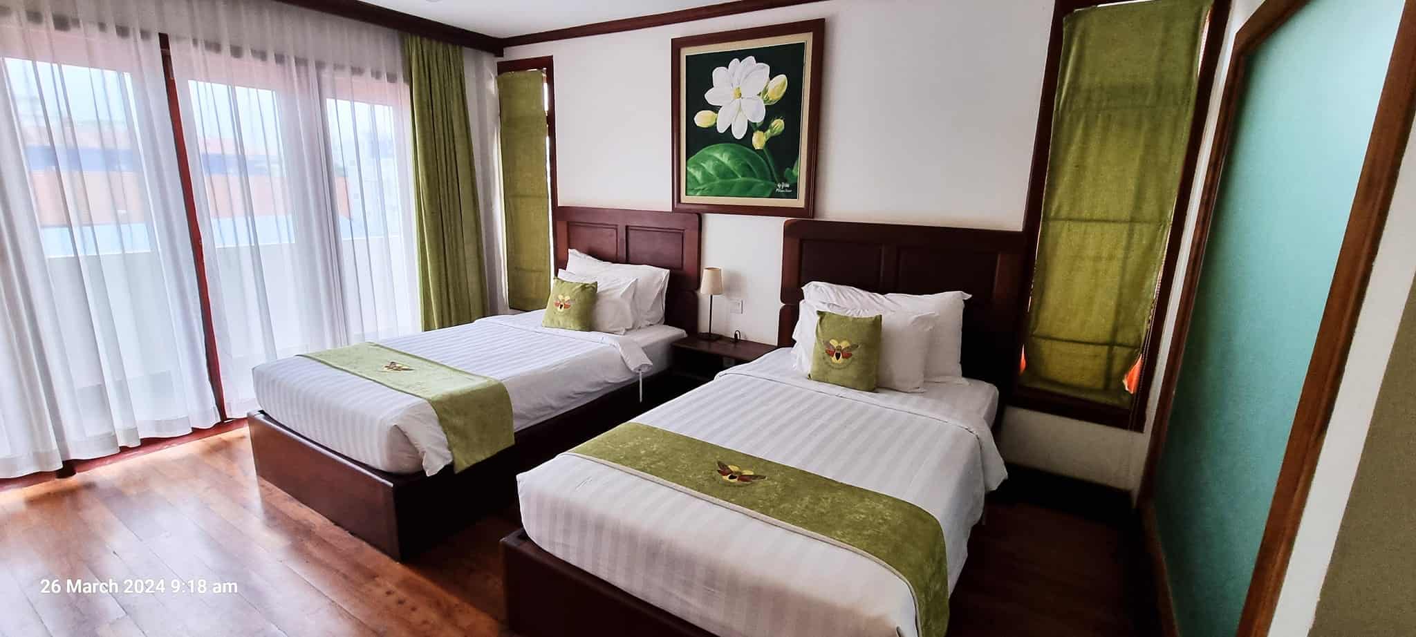 With a generous layout, this suite features a king-size bed, a private balcony overlooking the pool, and a large seating area. The bathroom includes both a bathtub and a shower for your comfort. Perfect for couples, honeymooners, or long-stay guests who want to experience the very best of Siem Reap hospitality.